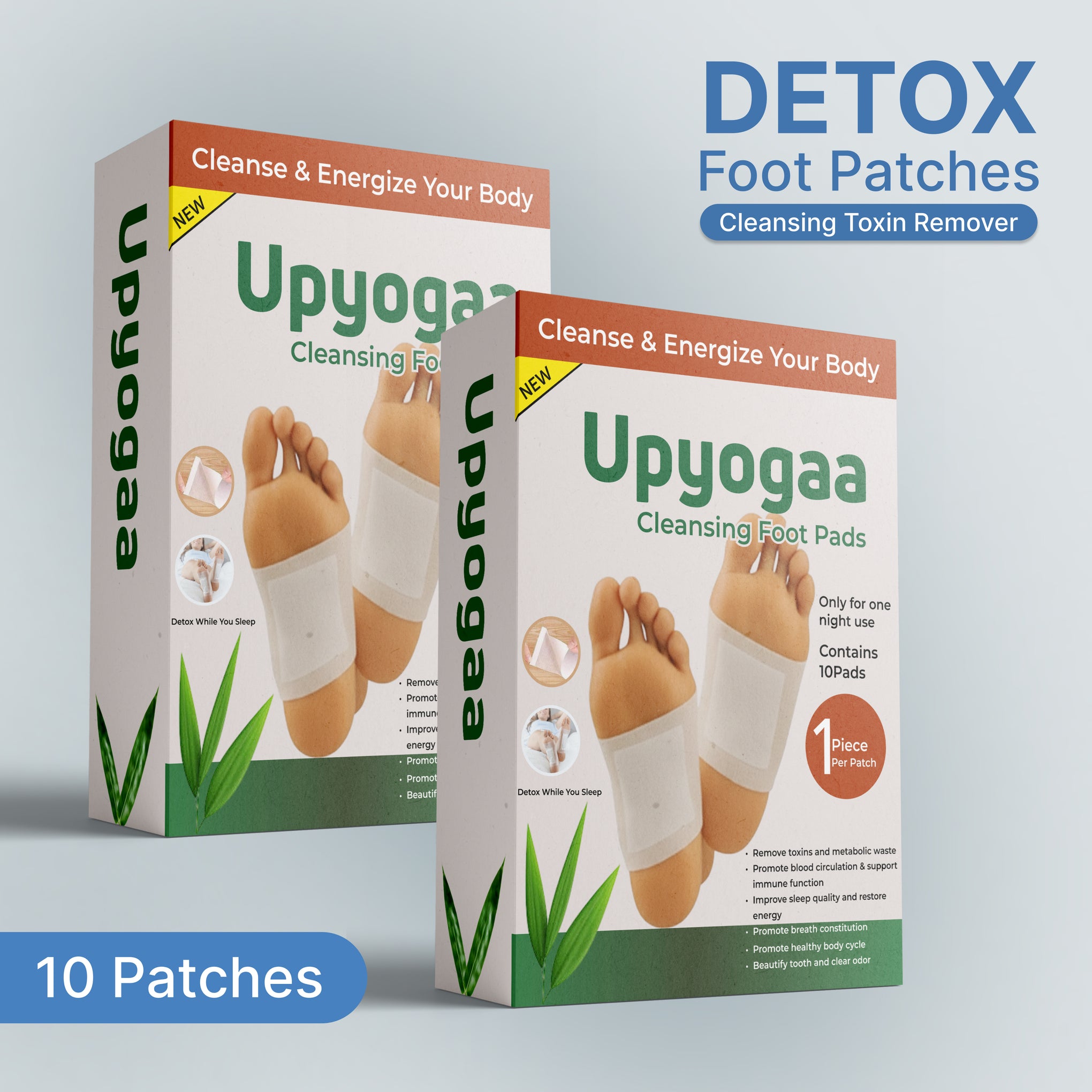 Upyogaa Premium Detox Foot Pads are adhesive patches designed to be applied to the soles of the feet overnight. Infused with a blend of natural ingredients such as bamboo vinegar, herbal extracts, and minerals, these foot pads aim to promote a sense of detoxification, support circulation, and help reduce fatigue while you sleep.