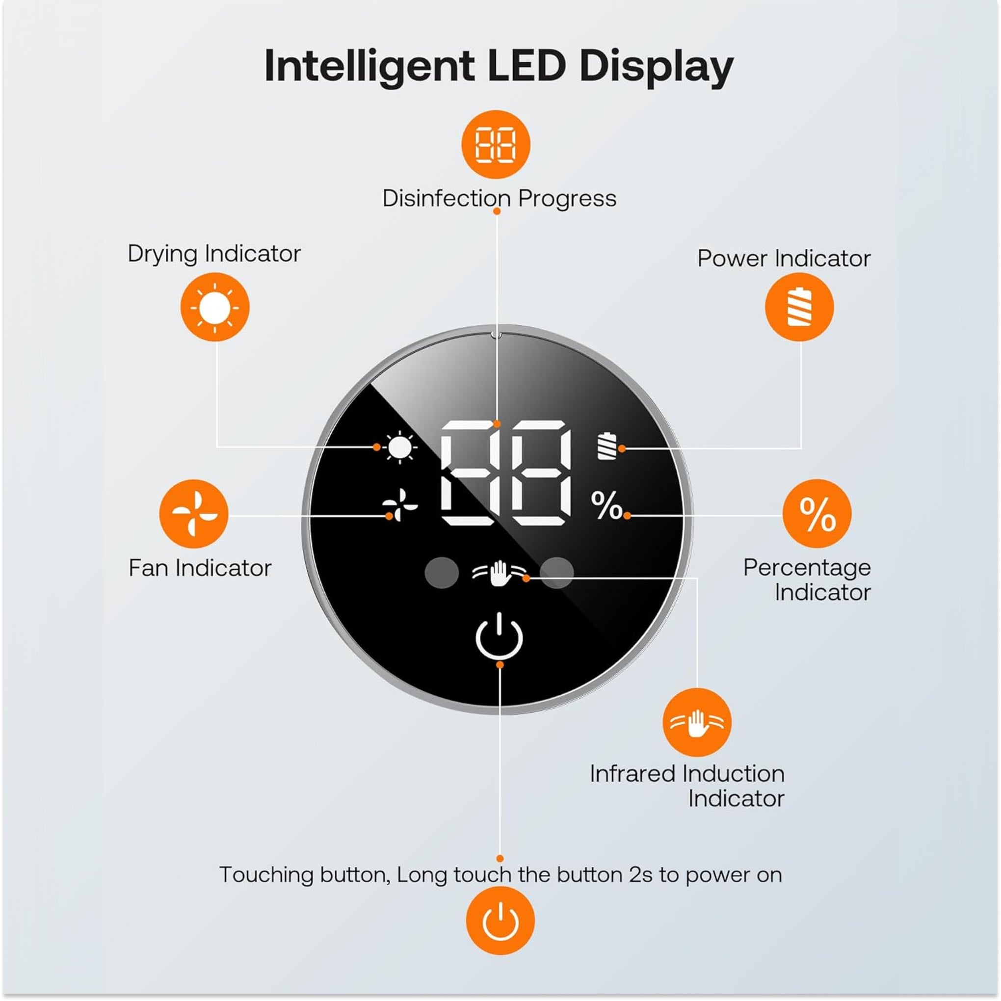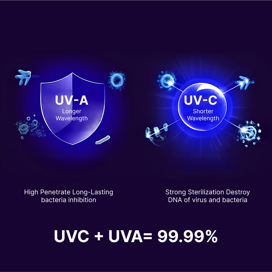 Equipped with dual-band UV light technology – UVC targets and destroys bacteria and viruses at a microscopic level by breaking down their DNA structure, while UVA enhances the sterilization process by degrading microbial proteins and reducing biofilm formation. Together, they ensure deep and effective sanitization.
