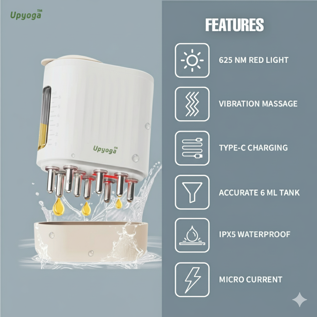 Upyoga Smart Scalp has a 6ml storage box with a clear scale for precise dosing and to avoid spillage. It is also waterproof and easy to rinse off after use. It is rechargeable and has a high vibration level to promote blood circulation in the head.