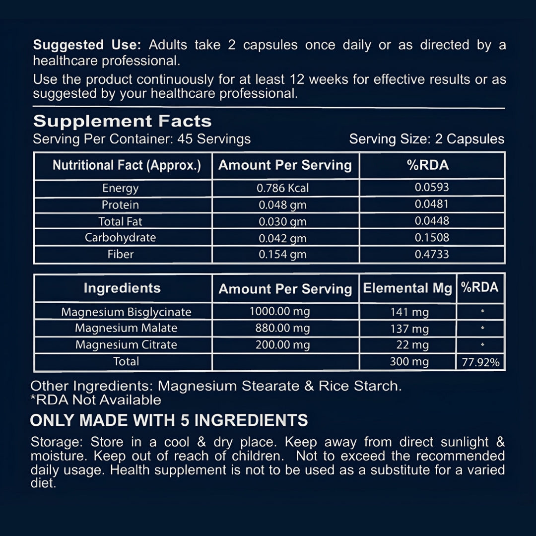 - Magnesium Bisglycinate – 141 mg elemental magnesium