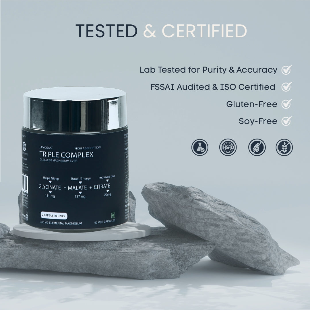Upyogaa Triple Magnesium Complex is a high-absorption blend of three premium magnesium forms—Glycinate, Malate, and Citrate—designed to support deep sleep, energy production, digestion, muscle relaxation, and overall nervous system health. With 300 mg elemental magnesium per serving, this clean, lab-tested formula helps your body absorb magnesium efficiently without digestive discomfort.