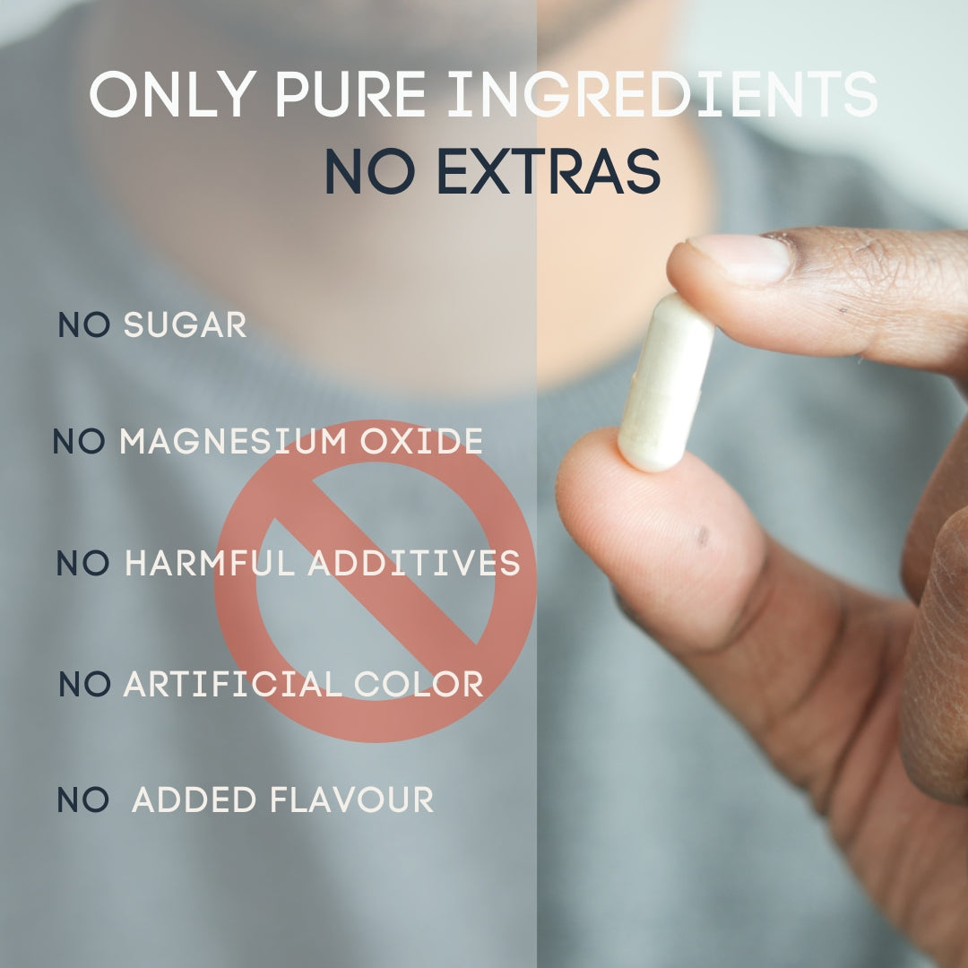 NO MAGNESIUM OXIDE, NO SUGAR, NO ARTIFICIAL INGREDIENTS, NO FLAVOUR, NO ARTIFICIAL COLOUR, NO HARMFUL ADDITIVES