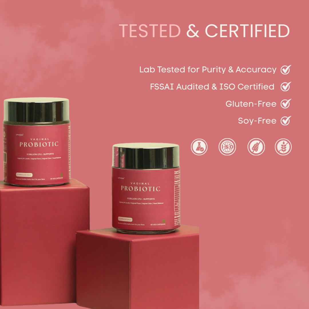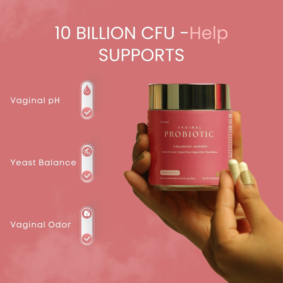 Restore your feminine health naturally with Upyogaa Probiotics, featuring a scientifically developed blend of 10 billion CFU of beneficial bacteria that rejuvenate vaginal flora and maintain optimal pH balance. Made with globally sourced strains and clinically validated ingredients, this daily probiotic supports odor management, yeast equilibrium, and overall vaginal wellness—helping you feel confident, balanced, and empowered every day.